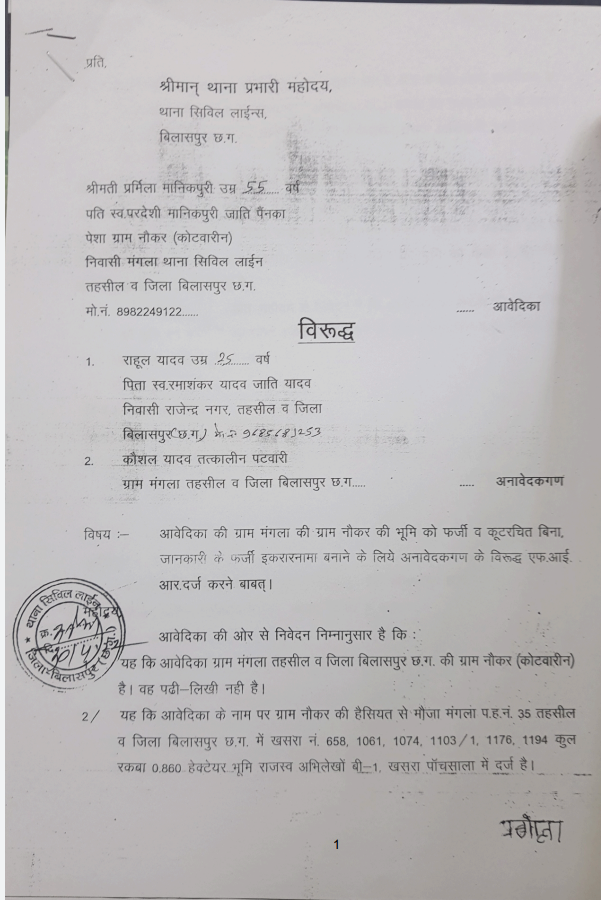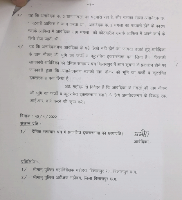 बिलासपुर -भ्रष्टाचार के आरोपी रहे एवं विभिन्न घोटालों में लिप्त पटवारी कौशल यादव का राजस्व की गड़बड़ी की लिस्ट लगातार सुरसा के मुंह के समान बढ़ता ही रहा है हालिया मामला मंगला का प्रकाश में आया है यहाँ इन्होने सभी हदे पार करके गरीब कोटवारीन को निशाना बनाया है इन्होंने शासन से मिली कोटवारीन की भूमि का दस्तावेज बना दिया जिससे अब उस भूमि का खरीद फरोख्त के लिये आम सूचना तक छपा दिया गया, इसमे पीड़ित कोटवारीन ने राजस्व विभाग सहित सिविल लाइन थाने में धोखाधड़ी का आरोप लगाते हुए शिकायत दर्ज की है और उपरोक्त व्यक्ति के खिलाफ FIR मांग की है जानकारी के अनुसार , प.ह.नं. 35, रा.नि.मं. सरकंडा, तहसील व जिला बिलासपुर (छ.ग.) स्थित कुछ खसरा नंबर क्रमश: 658, 1061, 1068, 1074, 1103/1, 1176, 1194 के कुल रकना में से आधी भूमि रकबा 0.860 हेक्टेयर भूमि भूमिस्वामी श्रीमती प्रमिला मानिकपुरी पति स्व. श्री परदेशी मानिकपुरी निवासी मंगला बस्ती के नाम दर्ज है जिसमे से राहुल यादव पिता स्व. श्री रमाशंकर यादव, निवासी राजेन्द्र नगर ने वकील के माध्यम से आम सूचना प्रकाशन कराया है वही शिकायत कर्ता महिला ने यह भी शिकायत की है कि राहुल यादव पटवारी कौशल यादव का अति निकटतम हैं इधर आम सूचना के माध्यम से बताया गया है कि उपरोक्त भूमि जो कि राजस्व रिकॉर्ड में भी कोटवार भूमि दर्ज है इसे प्रमिला मानिकपुरी पति स्व. श्री परदेशी मानिकपुरी से खरीदी कर रकम खरीदी का इकरारनामा निष्पादित कर रकम अदायगी मय बयाना स्वरूप चेक से दिया जाना बताया गया है.वही आम सूचना में यह भी बताया गया है कि इकरारनामा में भूमिस्वामी श्रीमती प्रमिला मानिकपुरी के द्वारा पंजीवन हेतु दस्तावेज बनाने का वचन दिया गया था परंतु बार बार लिखित एवं मौखिक सूचना देने के बाद भी उनके द्वारा पंजीवन नहीं किया जा रहा है एवं पंजीयन हेतु टालमटोल किया जा रहा है.एवं भूमिस्वामी के द्वारा उपरोक्त खसरा नंबर की भूमि का खरीद बिक्री का इकरानामा निष्पादित किया जा चुका है अतः सर्वसाधारण आम जनता को इस सूचना पत्र के माध्यम से सूचित किया जाता है कि यदि 15 दिवस के भीतर भूमिस्वामी के द्वारा पंजीवन नहीं किया जाता है तो भूमिस्वामी के खिलाफ फौजदारी एवं दीवानी मामला संबंधित अदालत में दावर किये जाने की बात कही गई है, जबकि ज्ञात हो कि शासन के नियम अनुसार कोटवारी भूमि का भूमि स्वामी हक शासन द्वारा दिया जाता है। संहिता की धारा 158 के प्रावधानों के अनुसार ऐसी भूमि जिसका भूमिस्वामी हक शासन द्वारा दिया गया है,