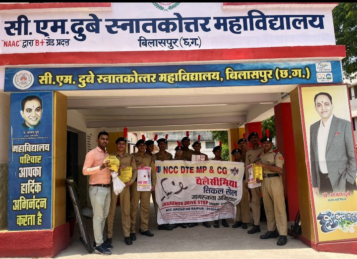 बिलासपुर- अंचल के प्रतिष्ठित सी.एम. दुबे स्नातकोत्तर महाविद्यालय, बिलासपुर में थैलेसीमिया सिकल सेल जन जागरूकता अभियान एन.सी.सी. 7-सी.जी. बटालियन के द्वारा कराया गया इस कार्यक्रम सम्मानीय डॉ. संजय दुबे, अध्यक्ष शासी निकाय के मुख्य आतिथ्य एवं प्रभारी प्राचार्य डॉ. संजय सिंह के अध्यक्षता में आज थैलेसीमिया मायनर जांच कराया गया जिसमें महाविद्यालय के छात्र-छात्राओं ने भाग लिया। पं. संजय दुबे ने कहा कि यह एक अनुवांशिक बीमारी है, अवश्यकता है इसे समझने की, डरने की नही हमारी थोड़ी सी सावधानी नौनिहाजलों को इस स्थिति में जाने बचा सकती है। उपरोक्त कार्यक्रम में थैलेसीमिया मेजर में बताया गया कि हर साल 10 हजार बच्चे थैलेसीमिया मेजर में जन्म लेते है, जब दो थैलेसीमिया मायनर के पुरूष-स्त्री आपस में विवाह करते है तो उनकी होने वाी संतान घातक थैलेसीमिया मेजर से पीड़ित हो सकती है, जो जान लेवा है और थैलेसीमिया परंपरागत, पीढ़ी में गुणसूत्रों द्वारा आगे जाती है, रक्त में हीमोग्लाबिन की मात्रा कम होने के कारण इन बच्चे को बार-बार रक्तदान लेना पड़ता है।