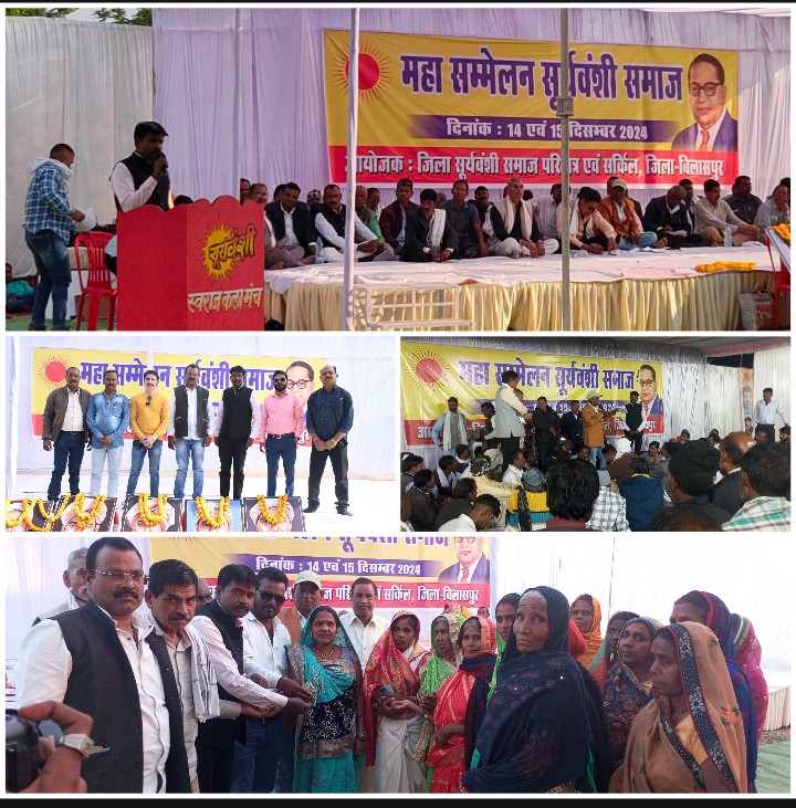 Bilaspur जिला सूर्यवंशी समाज का दो दिवसीय महासम्मेलन ग्राम खमतराई में आयोजित किया गया। सम्मेलन का विधिवत शुभारंभ संविधान निर्माता बाबा साहेब अंबेडकर के छायाचित्र एवं समाज के पंच देव के छायाचित्र में दीप प्रज्ज्वलित एवं माल्यार्पण के पश्चात किया गया,दो दिवसीय इस महासम्मेलन में प्रथम दिवस चर्चा एवं विचार विमर्श एवं सुझाव आमंत्रित किया गया। वही दूसरे दिवस समाज के पदाधिकारियों के द्वारा पूर्व नियोजित 12 सामाजिक बिंदुओं में से 11 बिंदुओं पर सभा मे उपस्थित पदाधिकारियो ने आपाधापी में आपसी सहमति बनाकर सहमति बना दी ,जिसे समाज को लागू करने का फैसला दिया गया ,