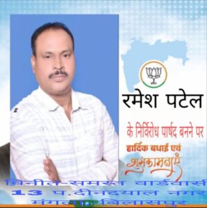 बिलासपुर नगर निगम के इतिहास में पहली बार वार्ड 13 के प्रत्याशी भारतीय जनता पार्टी के रमेश पटेल निर्विरोध पार्षद बन गए हैं बिलासपुर में नगरीय निकाय चुनाव के पूर्व नगर निगम में भाजपा पार्षद पद के प्रत्याशी ने जीत का परचम लहरा दिया है। भारतीय जनता पार्टी के रमेश पटेल वार्ड 13 पंडित दीनदयाल मंगला से कांग्रेस और अन्य पार्टी के प्रत्याशियों के नामांकन निरस्त होने की वजह से निर्विरोध पार्षद चुन लिये गए हैं। रमेश पटेल एक कृषक परिवार से ताल्लुक रखते हैं उनके पिता स्वर्गीय संतराम पटेल कृषक रहते हुए 4 बार 20 वर्षों तक निर्विरोध मंगल पंचायत के पंच रहे ।इसके बाद 18000 मतदाताओं वाले मंगला पंचायत के गायत्री रमेश पटेल भी निर्विरोध सरपंच रह चुकी हैं एक सामान्य कृषक परिवार से राजनीतिक जीवन में प्रवेश करने वाले रमेश पटेल 1989 में भारतीय जनता पार्टी के प्राथमिक सदस्य बने , 1993 में युवा मोर्चा मंगल के उपाध्यक्ष और 1995 में युवा मोर्चा अध्यक्ष रहे ,इसके बाद बिलासपुर शहर में युवा मोर्चा के कार्यकारिणी सदस्य रहे, सन 1999 में बिलासपुर भाजपा विधायक अमर अग्रवाल के विधायक प्रतिनिधि रहते हुए अनेकों उत्कृष्ट कार्य किये।वे इसी समय किसान मोर्चा मंडल के अध्यक्ष पद पर रहते हुए किसान हित में कार्य किये । 2003-4 किसान मंडल अध्यक्ष एवं 2008-9 में किसान मोर्चा के जिला अध्यक्ष बनाए गए ।श्रीमती गायत्री रमेश पटेल एक साधारण महिला रहते हुए भी बखूबी 5 वर्ष निर्विरोध सरपंच पद में रही एवं भाजपा महिला मोर्चा की निमित्त सदस्य हैं ।
