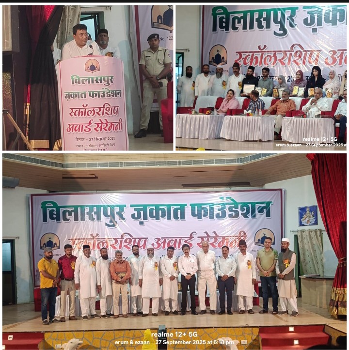 बिलासपुर। बिलासपुर जकात फाउंडेशन बिलासपुर संभाग के मुस्लिम बच्चों जिनकी माली हालत कमजोर है ऐसे बच्चों को हर वर्ष छात्रवृत्ति देकर उनकी पढ़ाई पूर्ण कराने का कार्य करती है । दिनांक 27 9.2025 शनिवार को बिलासपुर के लखीराम ऑडिटोरियम में हर साल की तरह इस साल भी जकात फाउंडेशन का भव्य कार्यक्रम रखा गया जिसमें बिलासपुर शहर के उन बच्चों को जो गरीबी के कारण अपनी पढ़ाई पूर्ण नहीं कर पाते हैं,