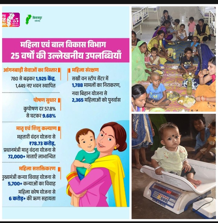 राज्य गठन पूर्व बिलासपुर जिले में मात्र 780 मुख्य आंगनबाड़ी केंद्र संचालित थे। आज यह संख्या बढ़कर 1 हजार 925 केंद्रों तक पहुँच चुकी है। इसी प्रकार 212 आंगनबाड़ी भवनों से बढ़कर अब 1 हजार 661 भवनों की स्वीकृति प्राप्त हुई है अर्थात 1 हजार 449 नए भवनों का निर्माण हुआ है। यह विस्तार ग्रामीण और शहरी दोनों क्षेत्रों में पोषण, बाल शिक्षा एवं मातृ स्वास्थ्य सेवाओं को सशक्त बनाने की दिशा में महत्वपूर्ण रहा है। पोषण सुधार और कुपोषण उन्मूलन में ऐतिहासिक प्रगति हुई है। वर्ष 2002 में पूरक पोषण आहार कार्यक्रम के अंतर्गत 82 हजार 285 हितग्राही लाभान्वित हो रहे थे,