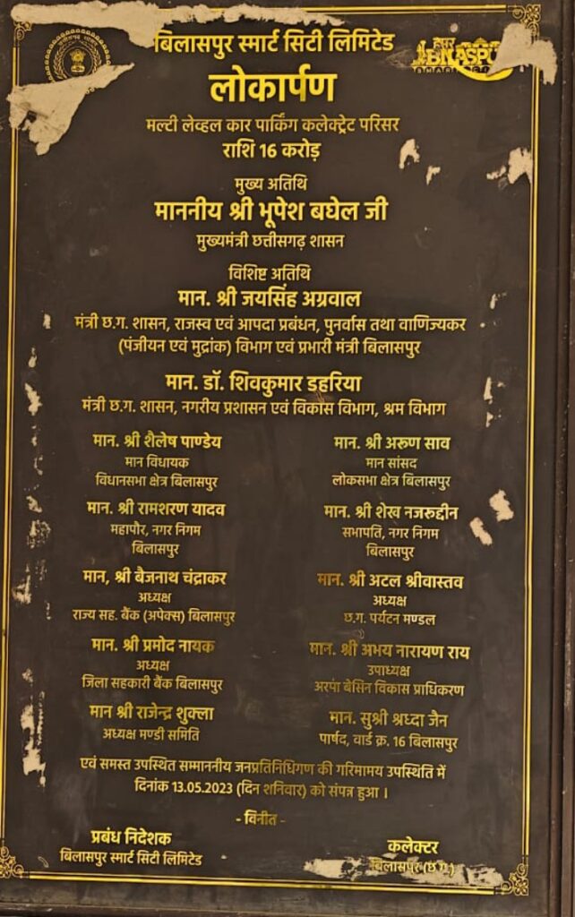 लोकार्पण कार्यक्रम में श्री जयसिंह अग्रवाल मंत्री छ.ग. शासन, राजस्व एवं आपदा प्रबंधन, पुनर्वास तथा वाणिज्यकर (पंजीयन एवं मुद्रांक) विभाग एवं प्रभारी मंत्री बिलासपुर की गरिमामयी उपस्थिति रही , वही इस मल्टीलेबल पार्किंग को बनाने के बाद मेंटेनेंस करने में निर्माण विभाग कोई रुचि नहीं ले रहा है यहां लगे भवन के मुख्य बोर्ड में विगत कई महीनों से बिलासपुर के नाम को ही खराब कर रहे है उस पर किसी का ध्यान नहीं जा रहा है ।महत्वपूर्ण तथ्य यह है कि इस मल्टीलेवल पार्किंग स्थल में रोजाना सैकड़ों की संख्या में बड़े बड़े अधिकारियों समेत शहर के नेताओं की वाहने लगती हैं पर किसी का भी उस पर ध्यान नही जा रहा है ,